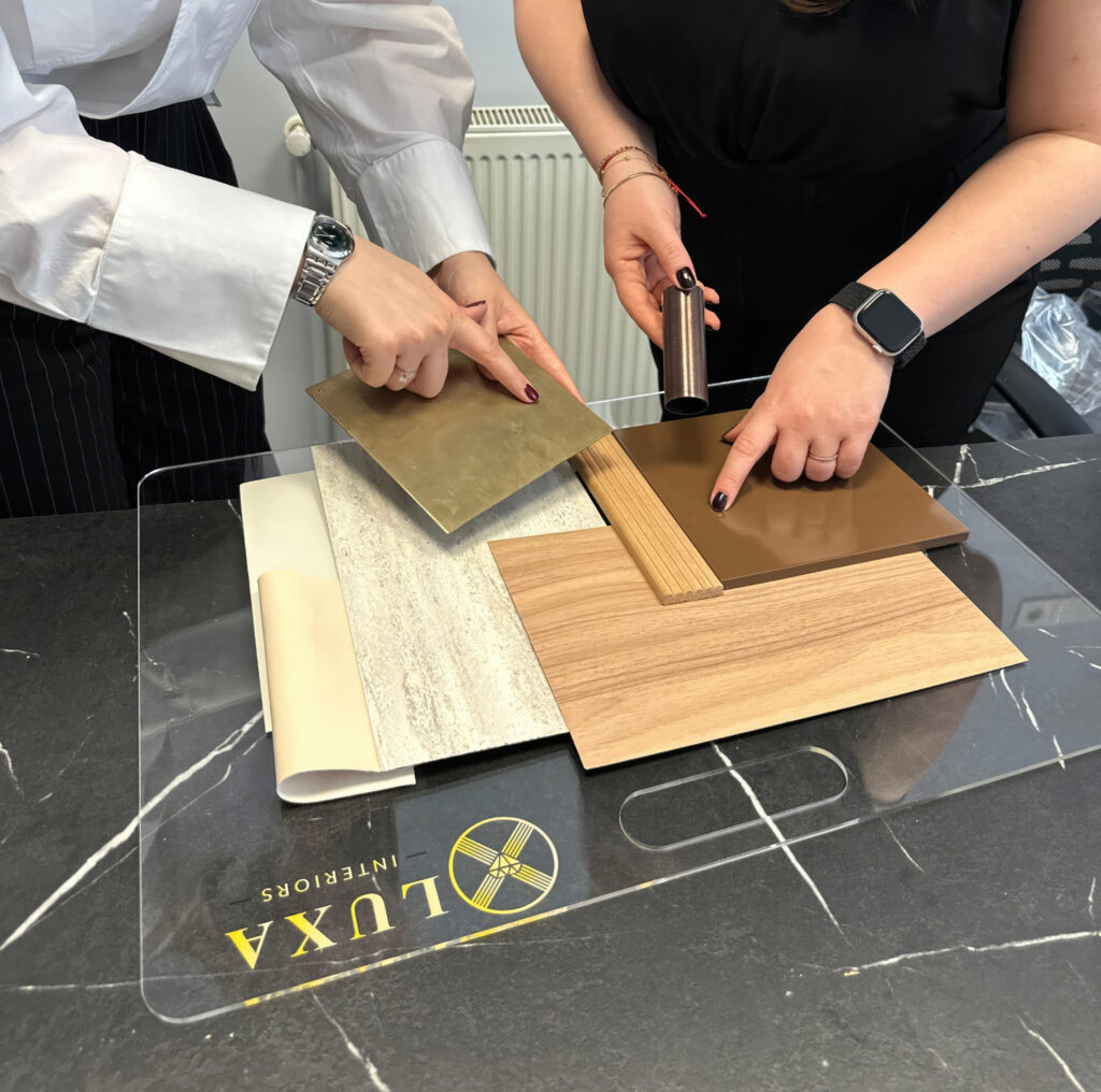 Selection of materials and preparation of a sample board for the client.